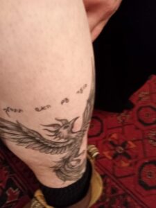 קעקוע "בוער עם האש תתהלך" מתוך השיר "הבית בוער" על רגל של אישה צעירה (ינואר 2026)